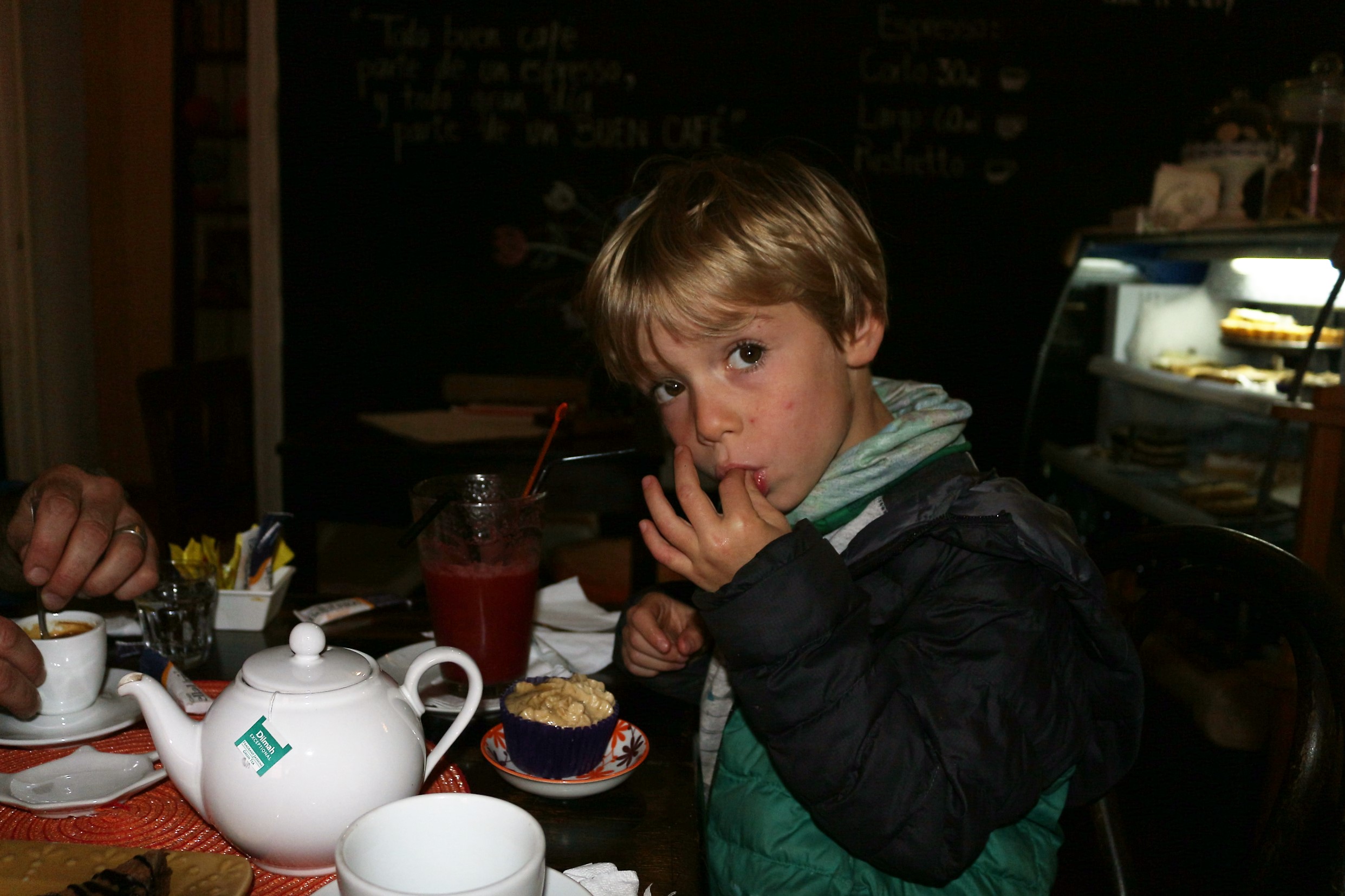 On mange dans un petit resto familial de la vieille ville, et la dame nous parle des attentats dès qu’elle apprend qu’on est français : elle nous demande si on a personnellement été touchés, et nous pose des questions car tout ça reste assez incompréhensible pour elle. Marius épate la galerie en demandant : « la cuenta, por favor, y un café para mi papá ! » (après une répétition assidue). Tous les deux connaissent quelques mots en espagnol et Marius nous en demande des nouveaux chaque jour. Ses « hola », « glacias » (oui, l’acquisition du r roulé n’est pas encore au point) et « adios » bien affirmés surprennent et font rire les gens. Aloïs est plus réservé pour le moment. L’après-midi, le vente se renforce encore, et le soir, la tempête est déclarée. On se dit qu’on est bien content d’être entre quatre murs ce soir…