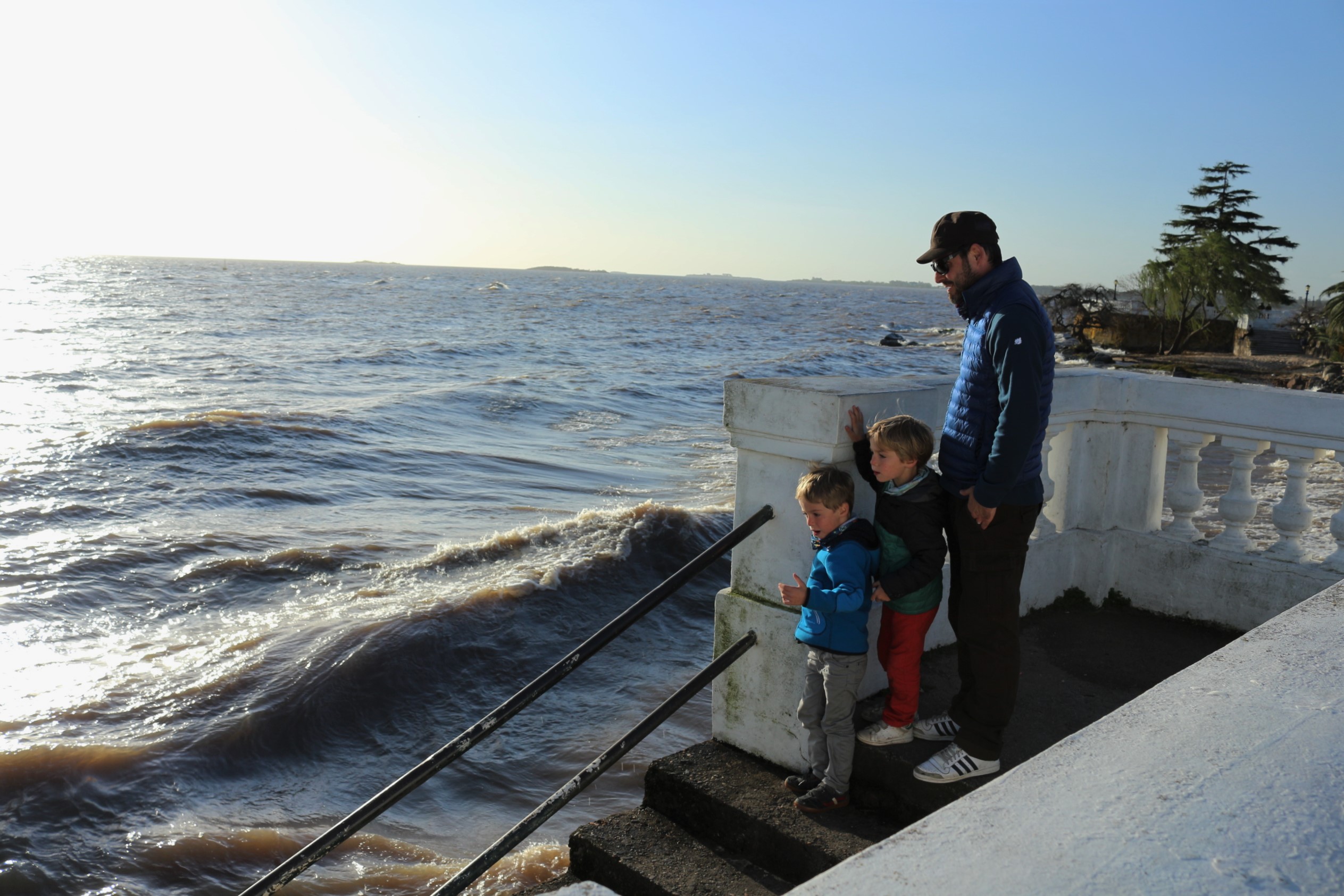 Mardi 13 septembre: ce matin, il ne pleut plus, mais le vent s’est levé et on entend le vacarme des vagues. Le rio est marron avec des crêtes d’écume blanches sur les vagues. On sort visiter un peu la petite ville, le parc de jeux, le port, la vieille ville (classée au Patrimoine de l’Unesco, ancienne ville coloniale portugaise), très mignonne avec ses vieux pavés irréguliers qui plaisent beaucoup à Marius, son phare blanc (les garçons sont hyper déçus de ne pas pouvoir y grimper, c’est interdit au moins de 8 ans), ses maisons anciennes, ses voitures presque aussi anciennes, ses petites places et son ancienne fortification. En tous cas, c’est très calme, les voitures s’arrêtent toujours pour nous laisser passer, ce qui contraste beaucoup avec Buenos Aires !