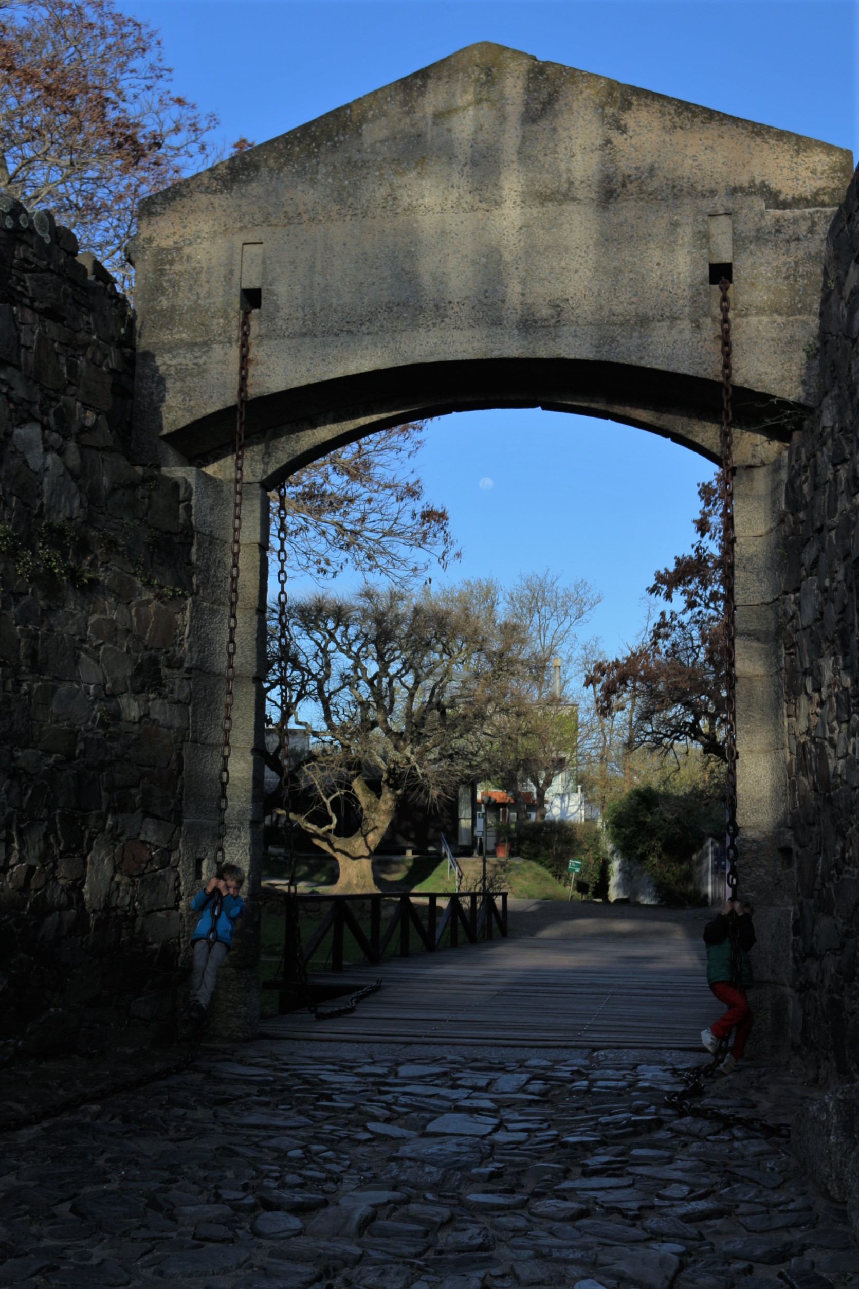 En fin d’après-midi, ils jouent sur une petite place de la vieille ville avec deux enfants anglophones, puis Marius jette un bâton sur un thermos posé sur un muret, et lorsqu’on l’accompagne pour qu’il s’excuse auprès du propriétaire, celui-ci, un habitant de la vieille ville de Conolina, commence à discuter avec nous. C’est parti pour une bonne heure d’explications diverses sur l’histoire de l’Uruguay, de Colonia, de Montevideo, le mouvement des Tupamaros, etc… Le monsieur est très enthousiaste et très content de pouvoir nous raconter tout ça. Lorsqu’il parle de Carlos Gardel, le célèbre auteur-compositeur et chanteur de tango, je lui demande s’il connait la théorie selon laquelle il serait né à Toulouse, mais il me répond « Gardel es Uruguayo. » C’est sans appel ! Hervé suit tant bien que mal toute la discussion en espagnol, tandis que les enfants ont été rejoints par Martina, la fille de 5 ans de notre interlocuteur. Marius s’est présenté d’un « me llamo Marius » prononcé « me chamo », avec la prononciation d’ici. Il y a donc 5 enfants de 3 langues différentes qui jouent ensemble, courent partout et se réfugient en hurlant dans un arbre dès qu’accoure le chien de Martina. Petit aparté sur la 2eme passion des Uruguayens après le maté : les chiens. Il y en a partout ! Dans la rue, des tas de chiens passent la journée à se promener ou à dormir. Ce ne sont pas des chiens errants, ils sont plutôt grands, beaux (oui oui c’est moi qui dis ça !), bien soignés et calmes. Et le soir et la nuit, ça aboie, aboie…